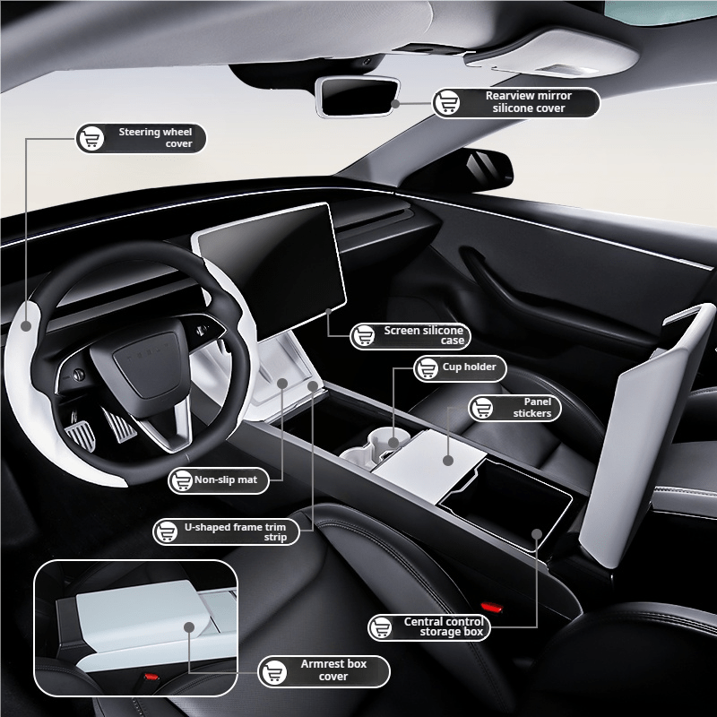 9pcs Set - for Tesla 2024+Model 3 Highland & 2025+ for Model Y Juniper Accessories White Interior Trim Kit Storage Box, Steering Wheel, Durable Car Mods, for Tesla Model Y Accessorie, for Tesla Model Y Juniper, Car Accessory, Car Accessory Interior